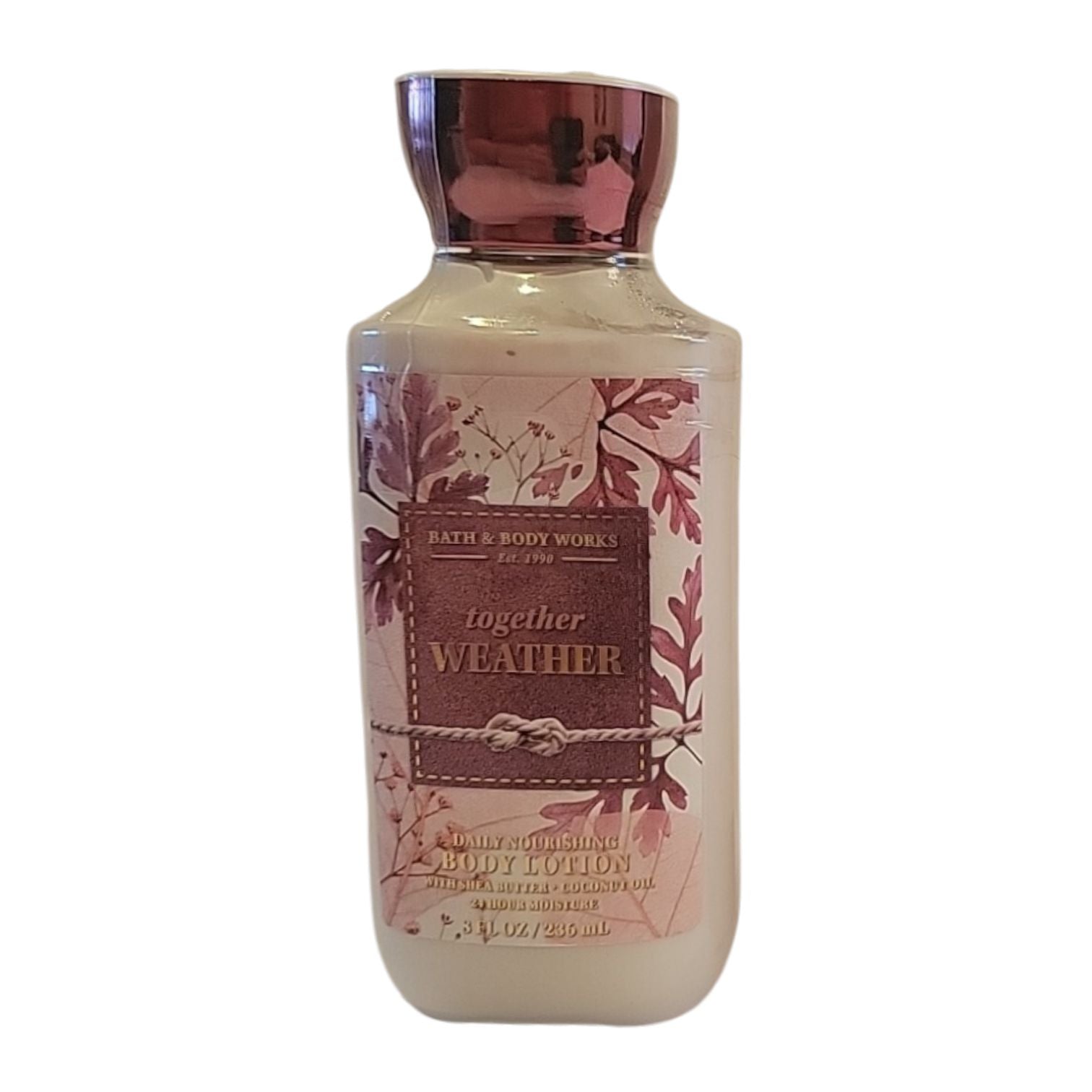 Experience daily nourishment and moisturizing with the Bath and Body Works Together Weather Daily Nourishing Body Lotion with Shea Butter + Coconut Oil (8 FL OZ / 236 mL). This lotion provides 24 hours of continuous moisture, leaving your skin feeling soft, nourished, and conditioned. Infused with the goodness of coconut oil, shea butter, and vitamin E, it’s our lightest formula designed to pamper your skin.